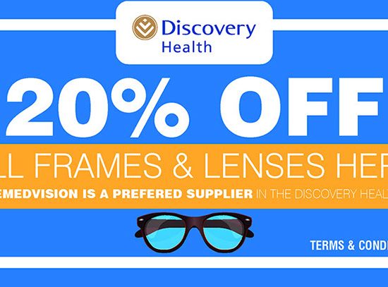 You can get 20% discount on your frames and eyeglass lenses when you visit an optometrist in the Discovery Health Optometry Network. The discount is immediate at point of sale and will help you preserve your Medical Savings Account. The benefit is available to Discovery Health Medical Scheme members (excluding KeyCare members) and members of selected Schemes administered by Discovery Health.